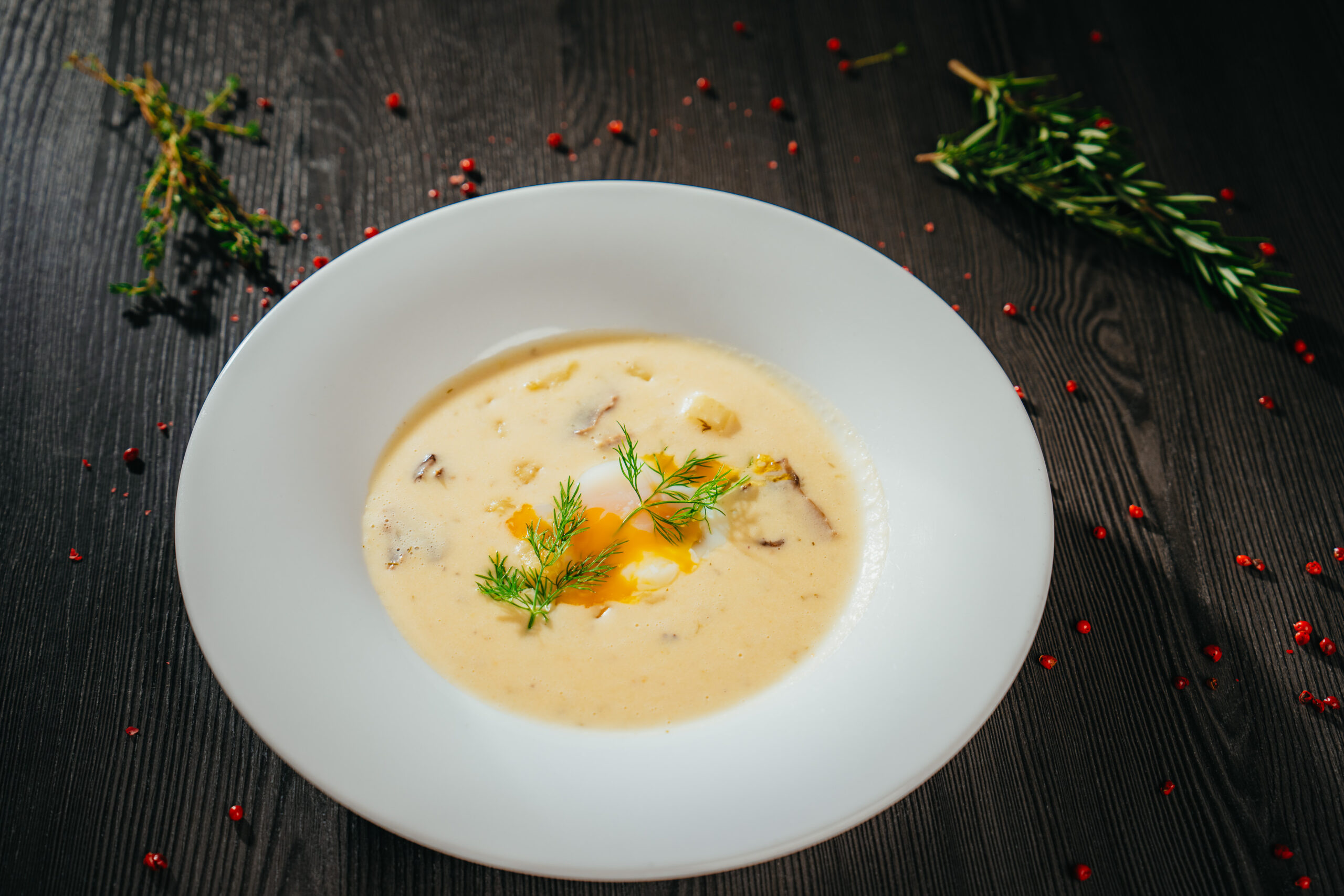 Erbsensahnesuppe mit Croutons aus Weißbrot