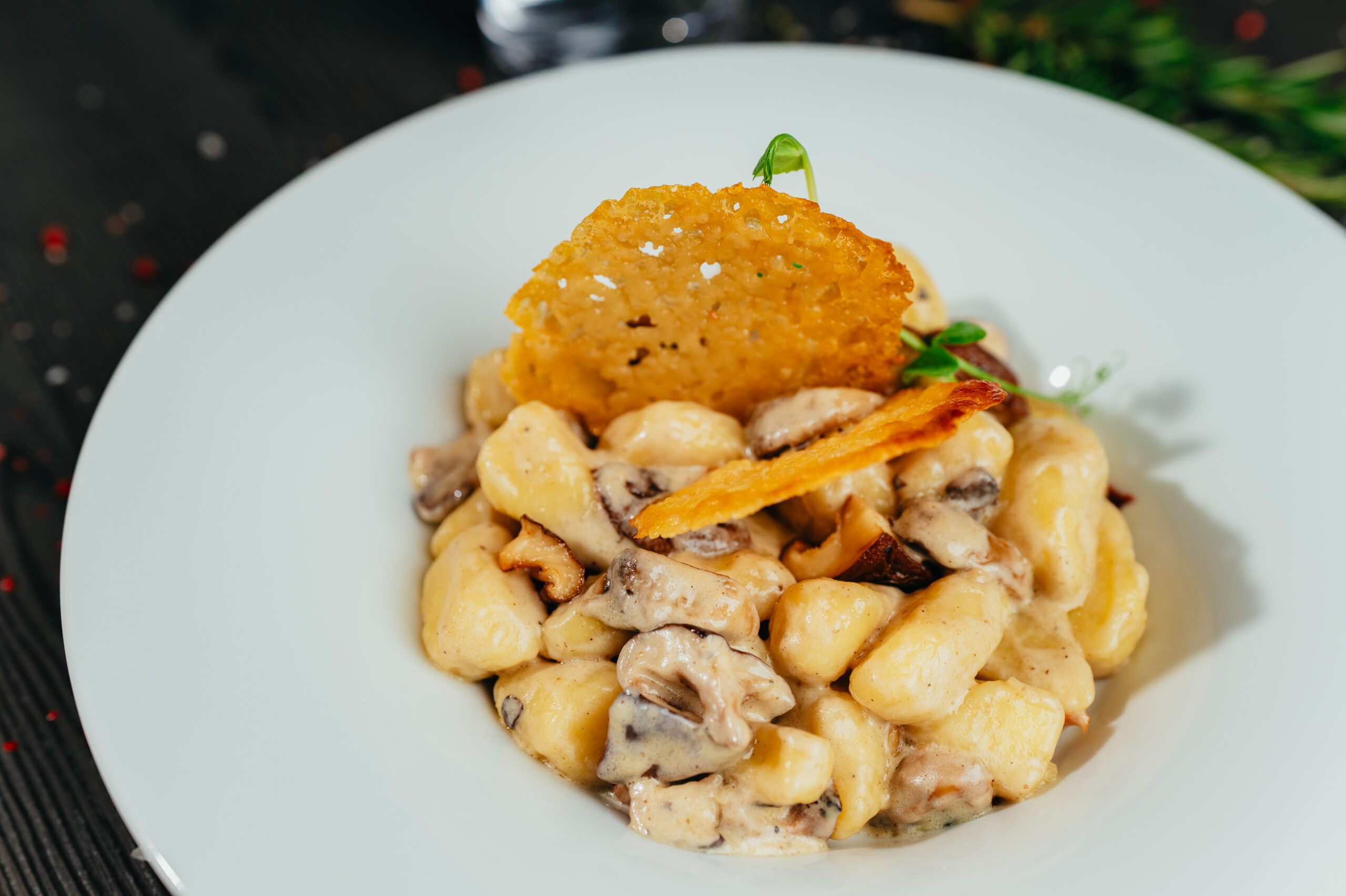 2 Hausgemachte Kartoffelklöße, Sahne, Steinpilze, Parmesan-Chips