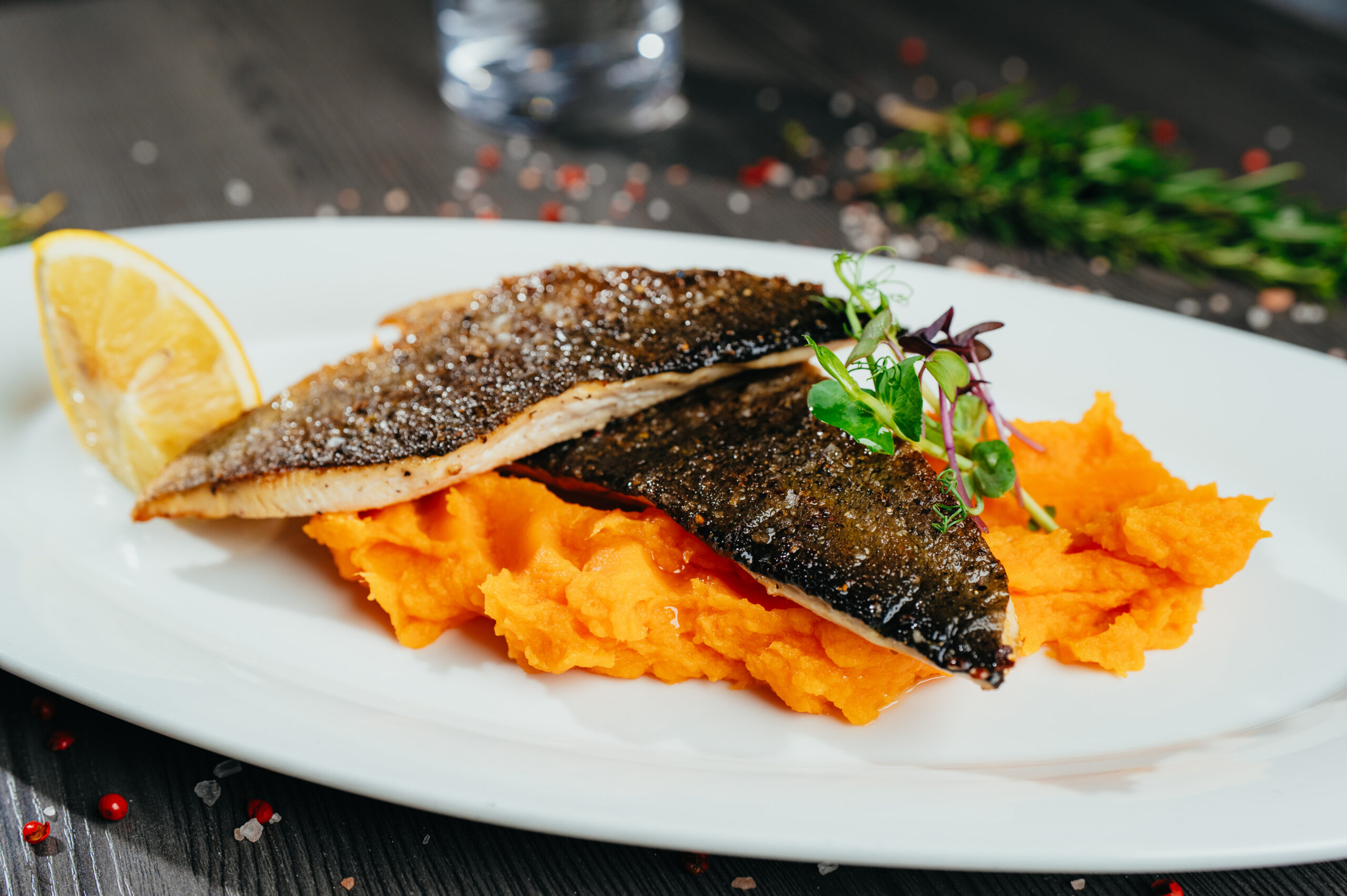 1 Roasted rainbow trout fillets, sweet potato purée, herb butter