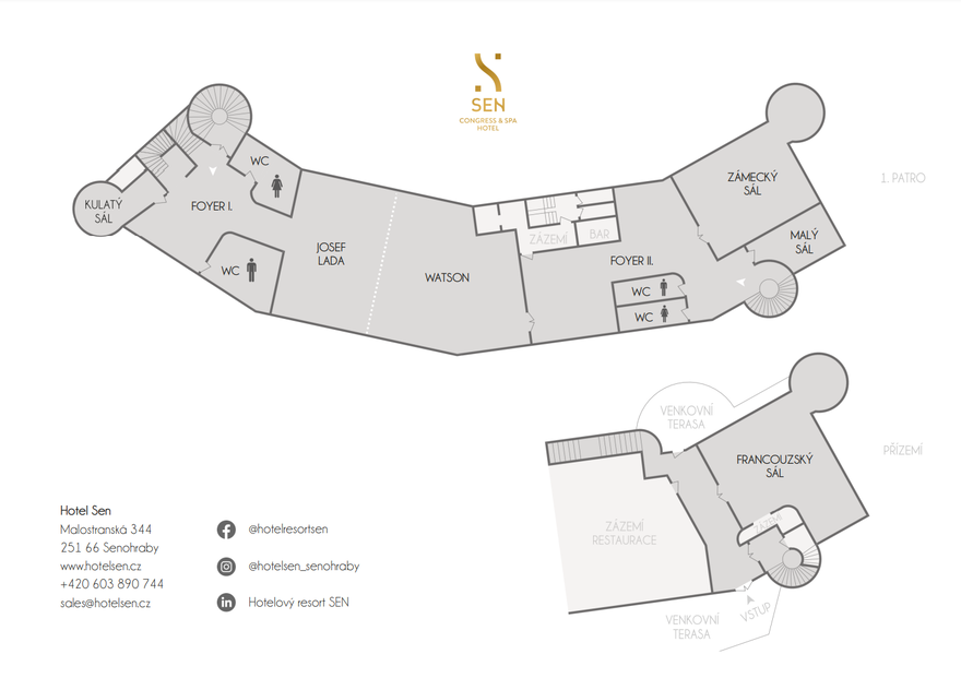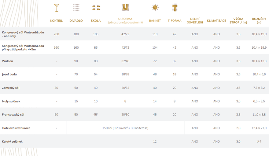- Sály Josef Lada a Watson je možné spojit do jednoho velkého sálu.