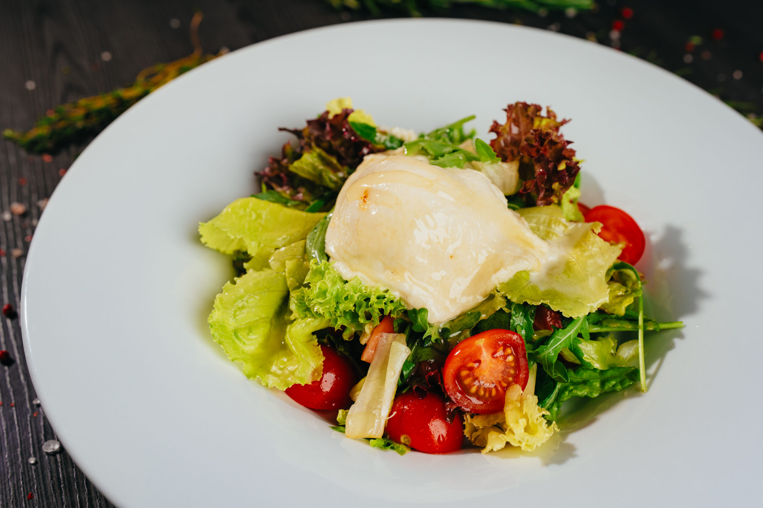 Listové saláty, rukola, cherry rajčata, grilovaná mozzarella