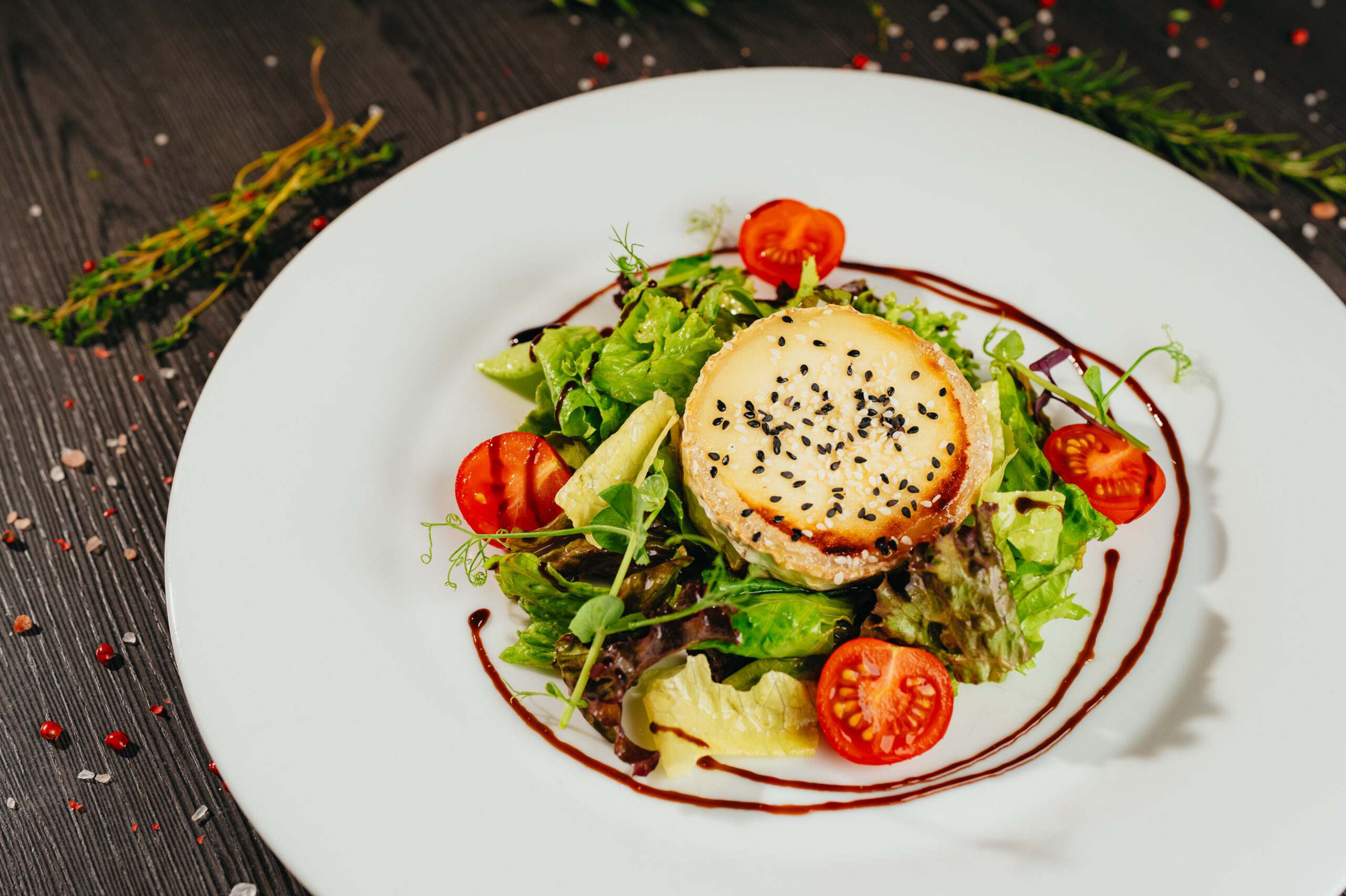 Trhané listové saláty, cherry rajčata, zapečený kozí sýr, med, sezam