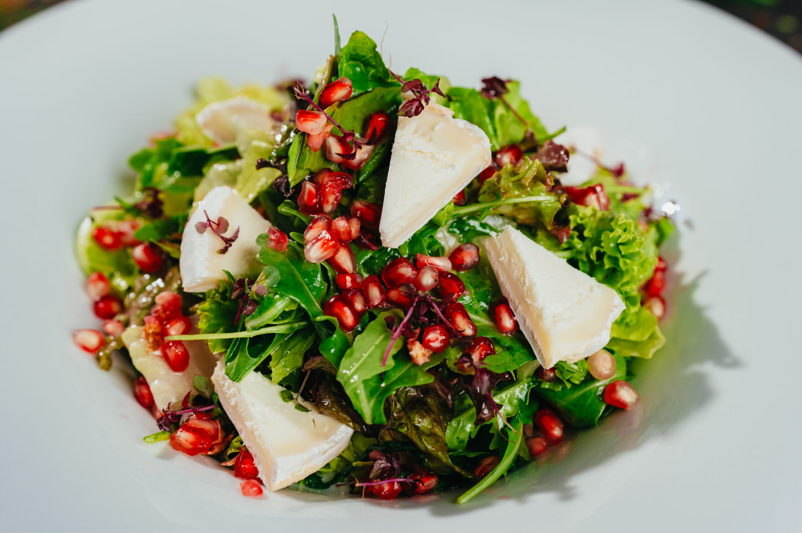 Rukolový salát s granátovým jablkem, kozím sýrem a medem