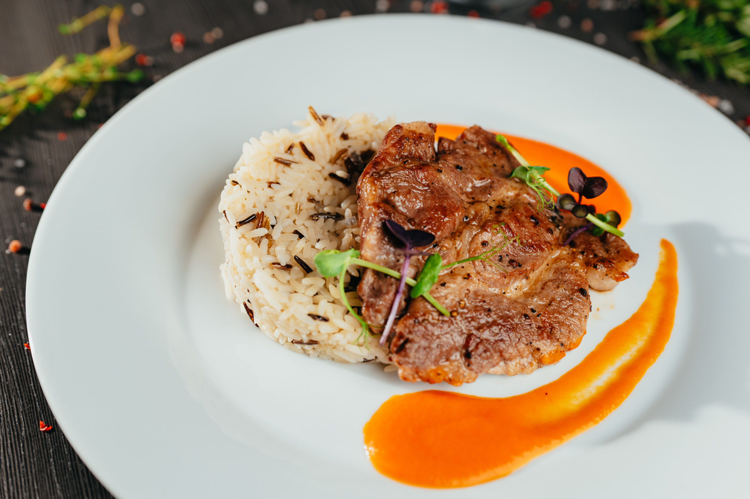 1 Steak z vepřové krkovičky, divoká rýže, omáčka z pečených paprik