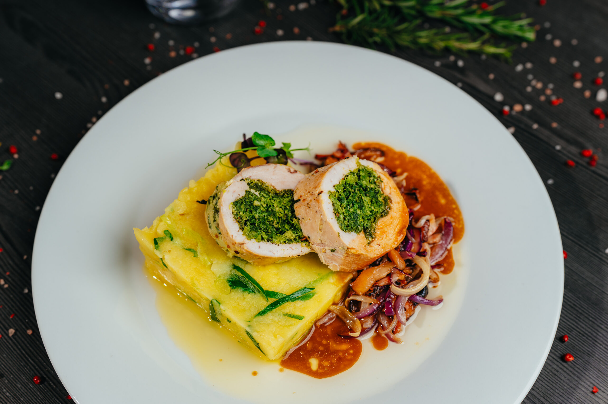 1 Krůtí roláda se špenátem, šťouchaný brambor, slanina, cibulka