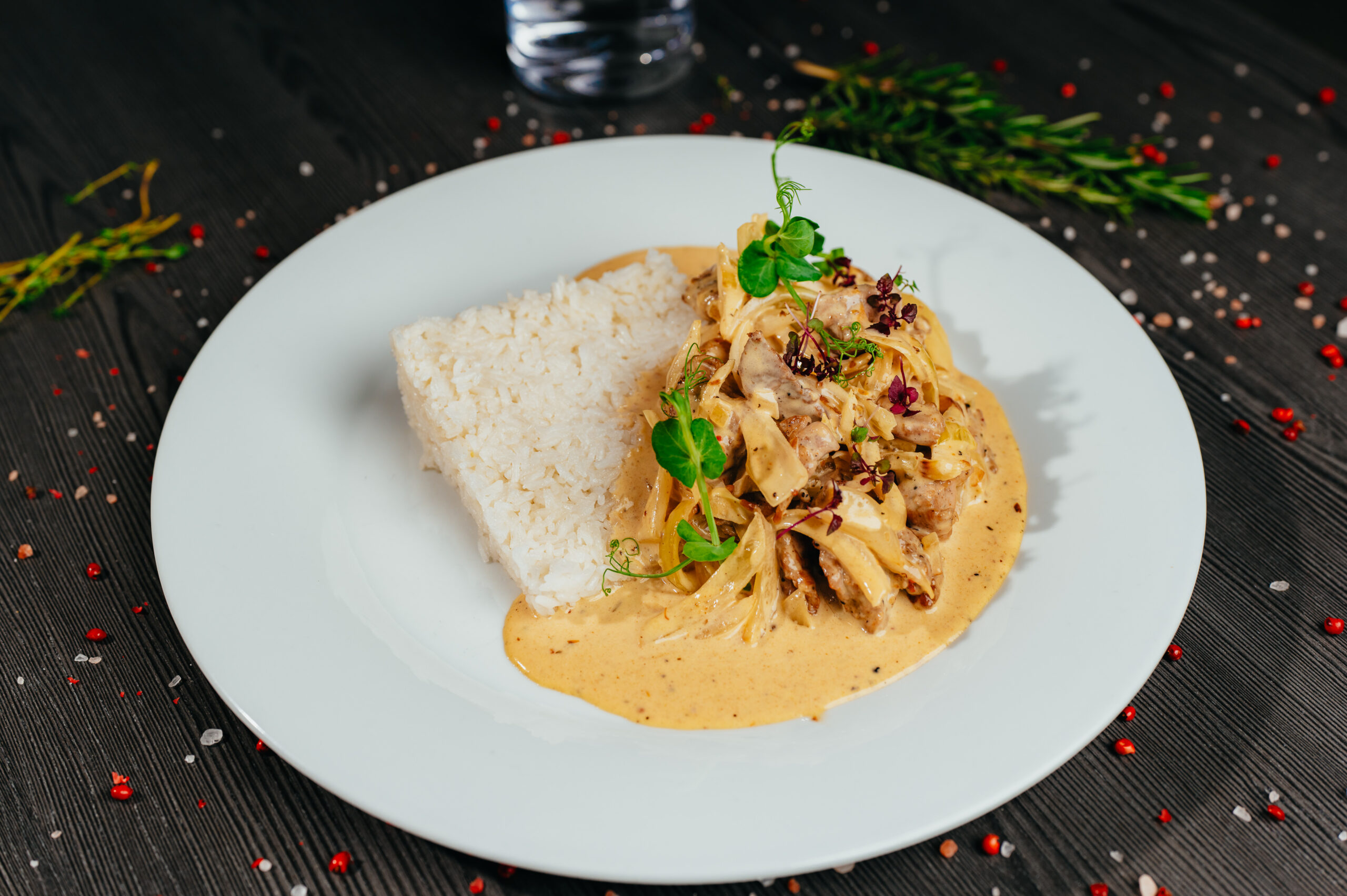 1 Špičky z vepřové panenky, omáčka z dijonské hořčice, jasmínová rýže