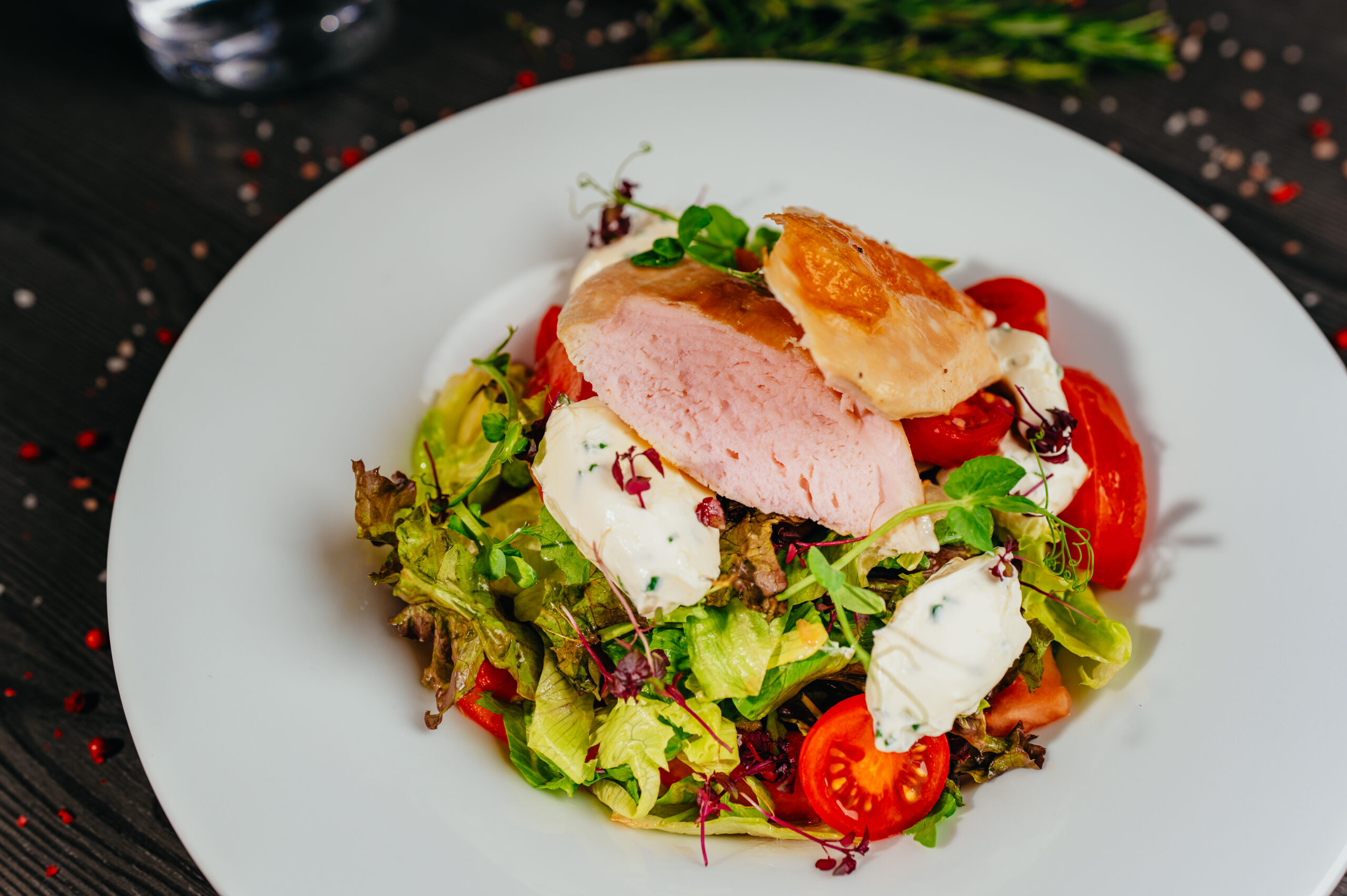 2 Salát s grilovaným kuřecím prsíčkem, crème fraîche s pažitkou