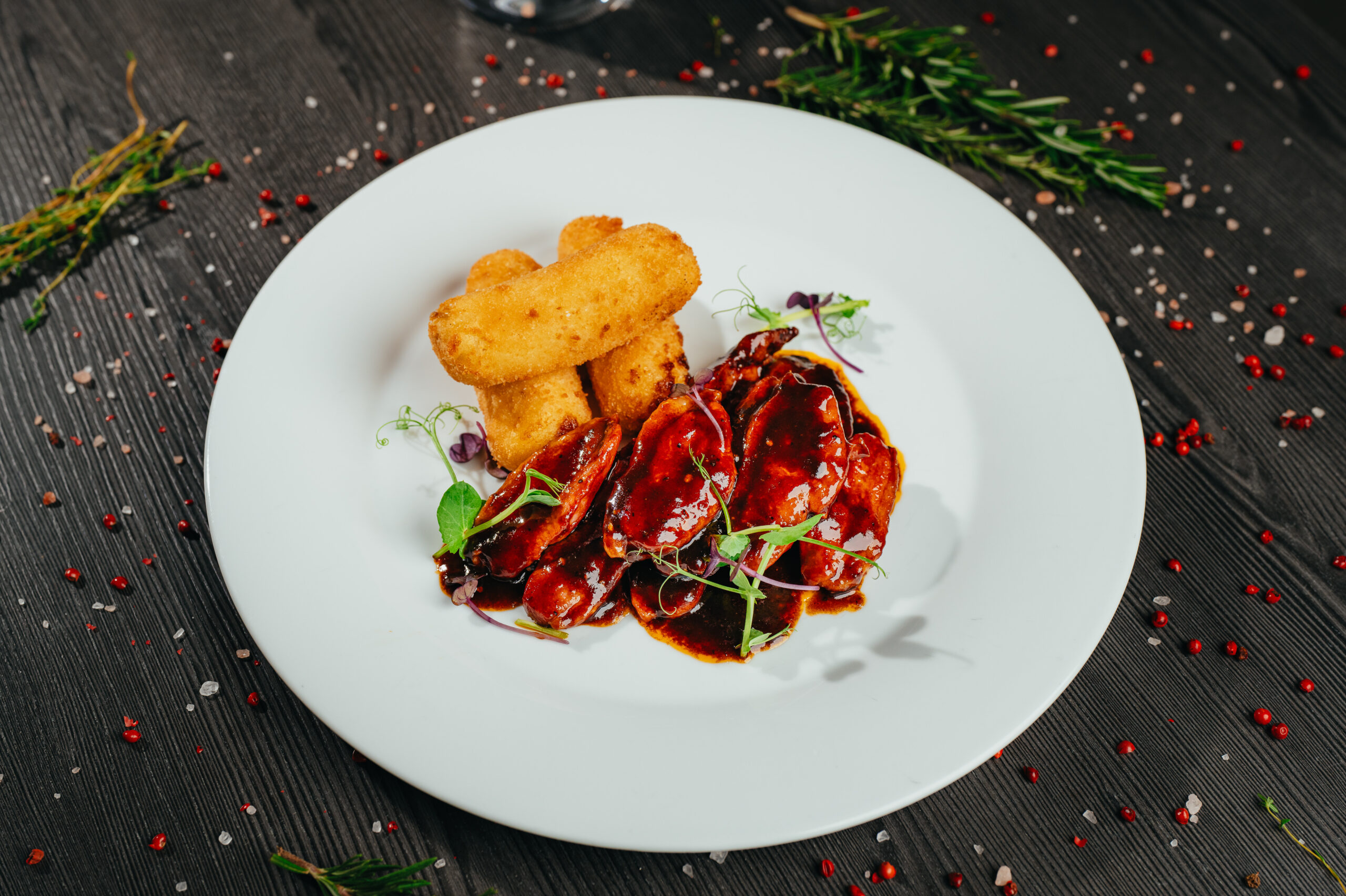 1 Grilovaná kachní prsa, švestková omáčka, bramborové krokety