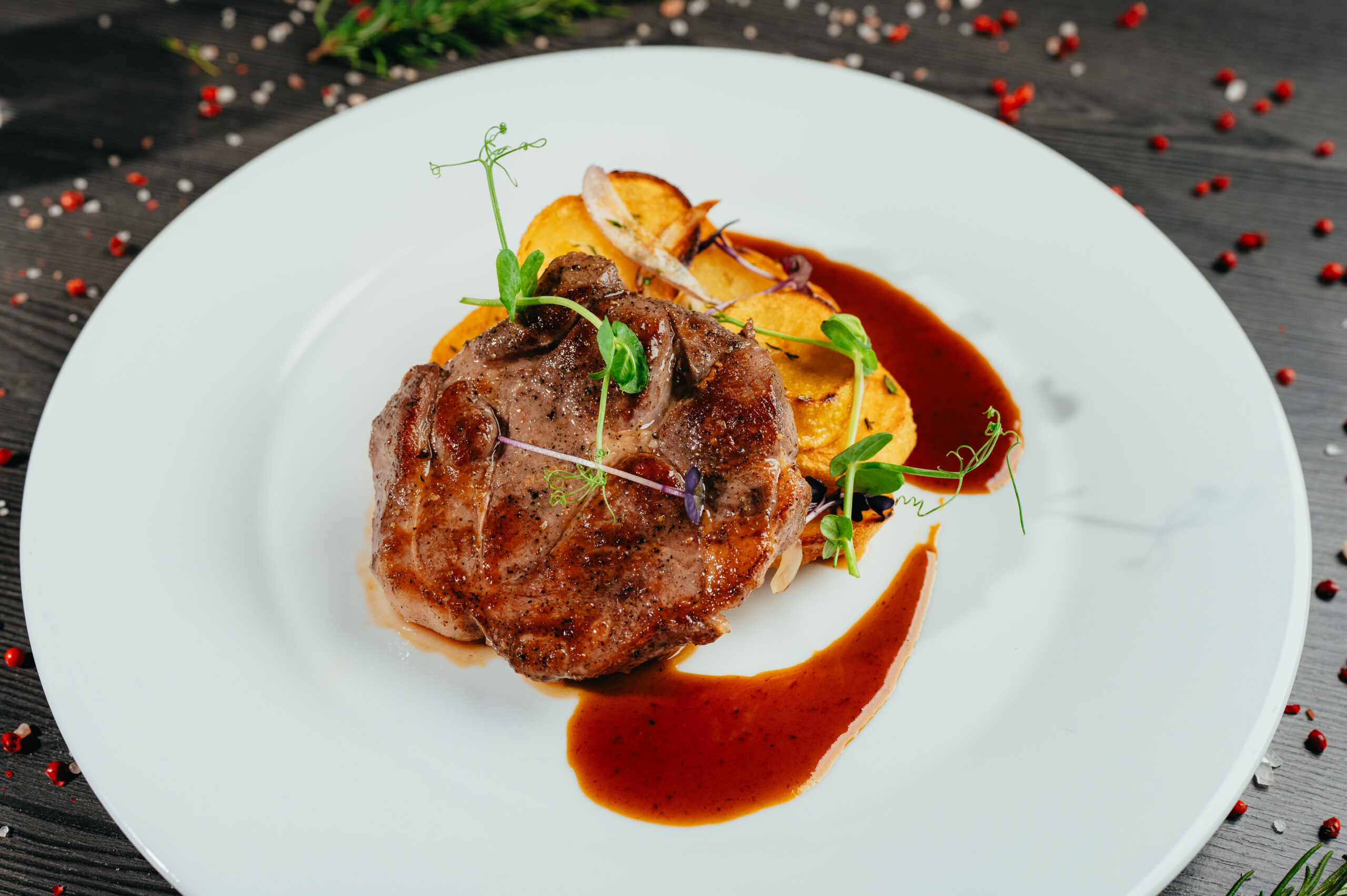2 Grilovaná vepřová krkovička sous vide, medová omáčka, restované brambory s šalotkou
