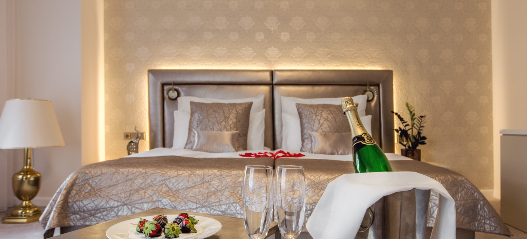 - Romantické uvítání na pokoji (okvětní lístky růží, lahev sektu, jahody v čokoládě).