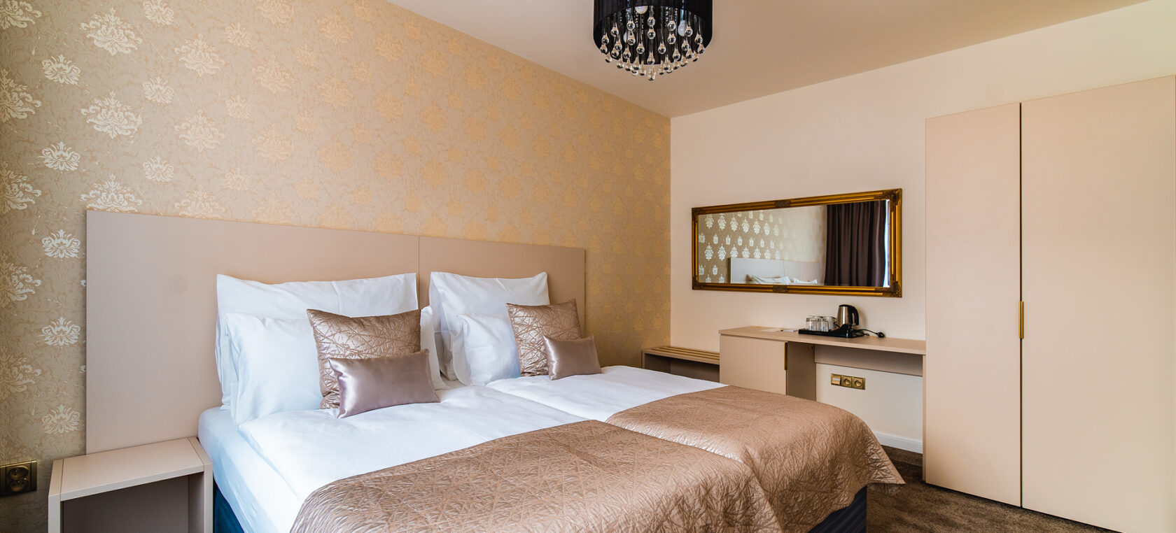Pokoje Standard*** v budově Depandance nabízí ubytování v samostatném objektu, který od hlavní budovy dělí nádvoří s parkovacími místy. Manželské lůžko ve všech pokojích, na přání lze rozdělit na dvě samostatná lůžka.