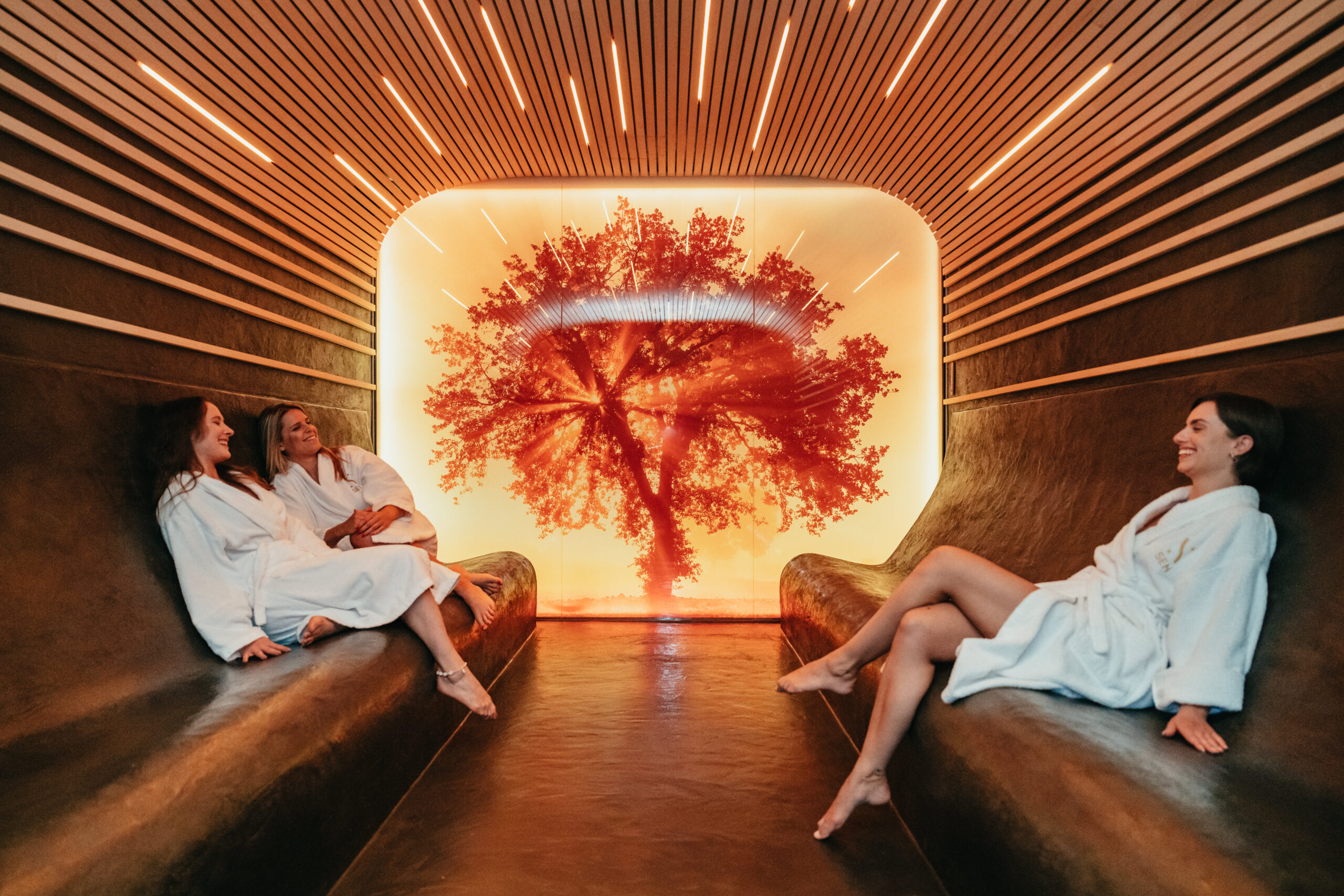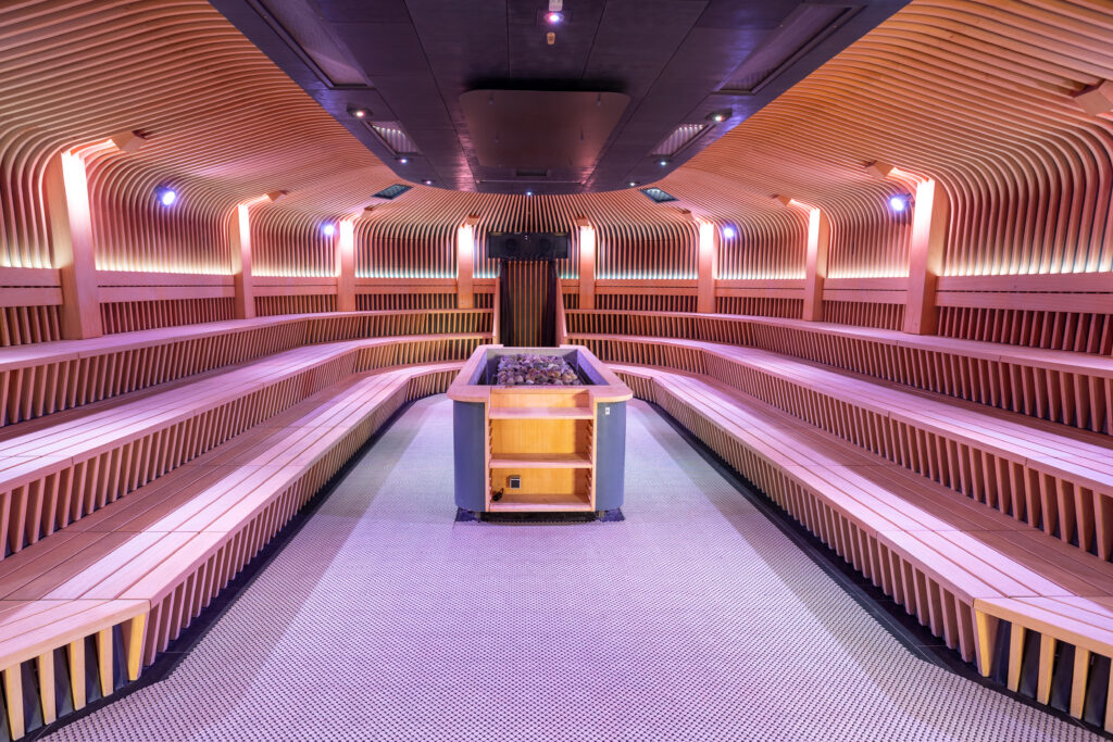 V jedinečné medové sauně, která je inspirována plástvemi divokých včel, dochází díky kombinaci automatického parního nárazu a vysoké teploty k intenzivnímu pocení.