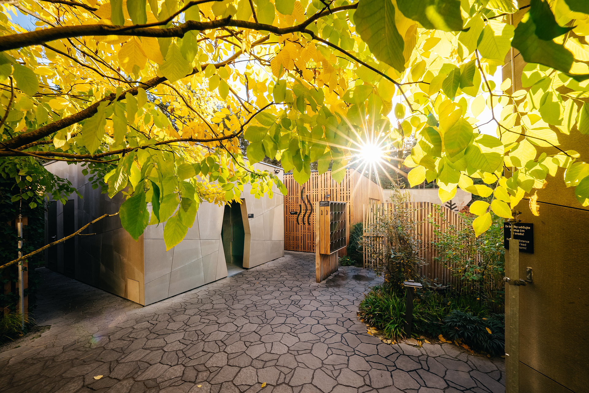 Zavěšené dřevěné dýhy jsou dominantou prostoru sadové sauny. Svým pohybem a hrou světla a stínu připomínají ovoce a lístky na stromě.