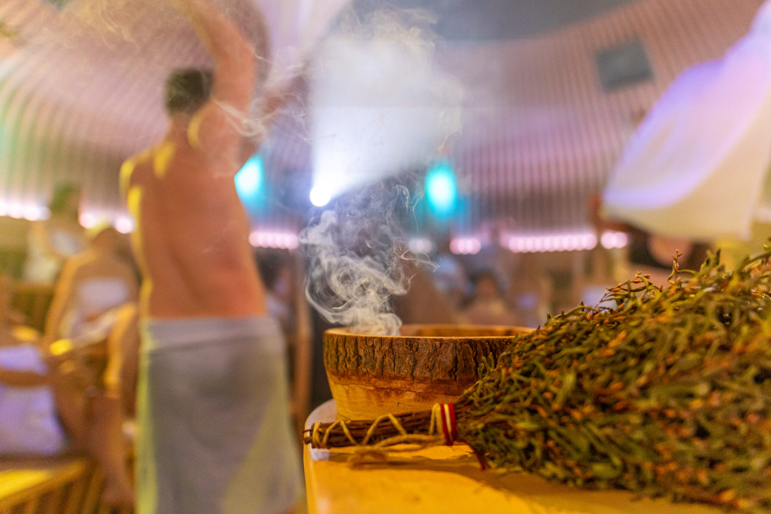 Prostorná venkovní sauna v saunovém světě, která je jedinečná umístěním kamen uprostřed místnosti a celodenním programem ve formě saunových ceremoniálů. Vlhkost i teplota v místnosti se může měnit v závislosti na prováděných ceremoniálech.