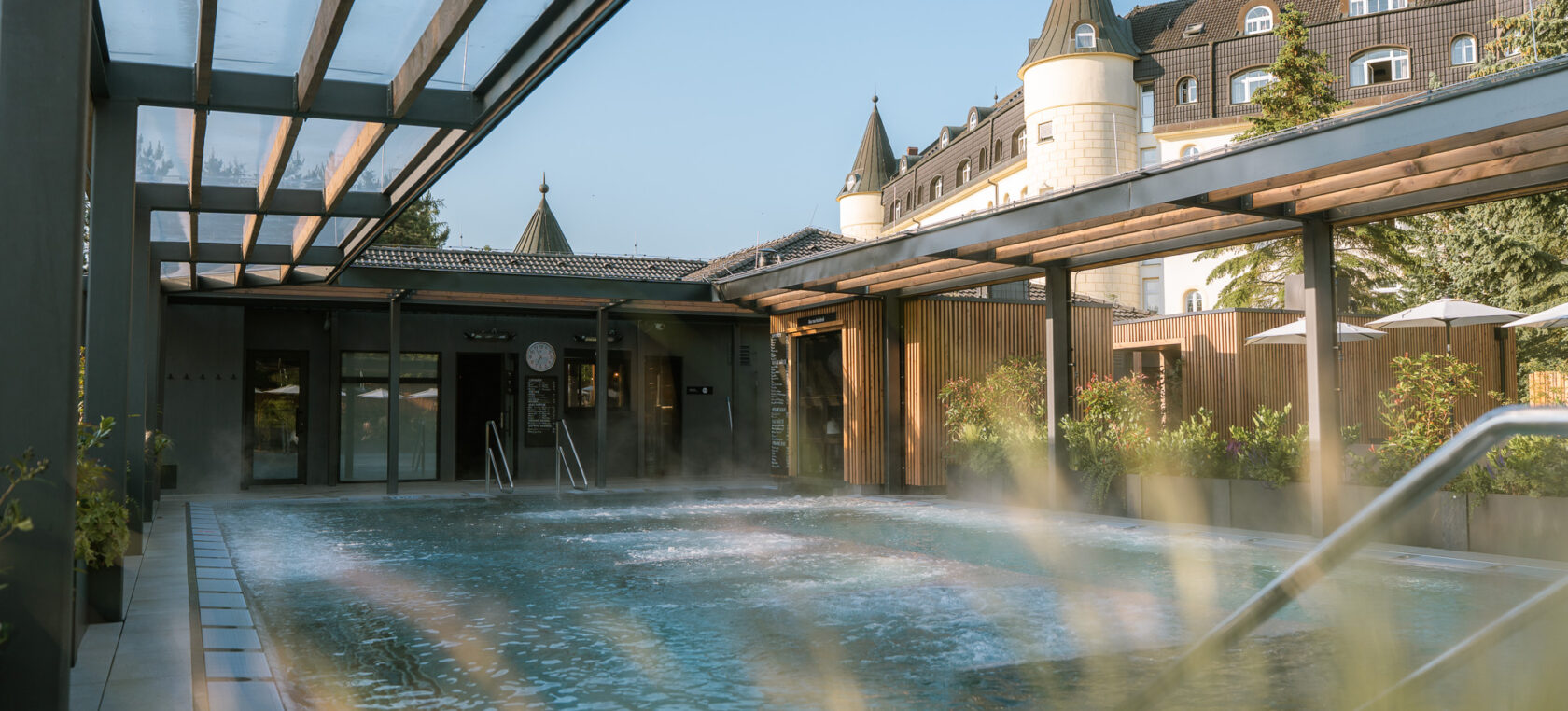 Termální venkovní bazén s vířivými lavicemi je otevřen za každého počasí. Teplota vody se přizpůsobuje venkovnímu počasí, v zimě se teplota pohybuje okolo 35 až 37 °C, v létě má voda příjemných 30 až 33 °C. Termální bazén s bublinkami přináší jedinečné spojení relaxace a zdravotních benefitů. Teplá voda uvolňuje svaly, zmírňuje bolesti kloubů a zlepšuje krevní oběh, což podporuje celkovou regeneraci vašeho těla. Přímo z bazénu si můžete objednat váš oblíbený nápoj. Bazén je součástí plavkové zóny.